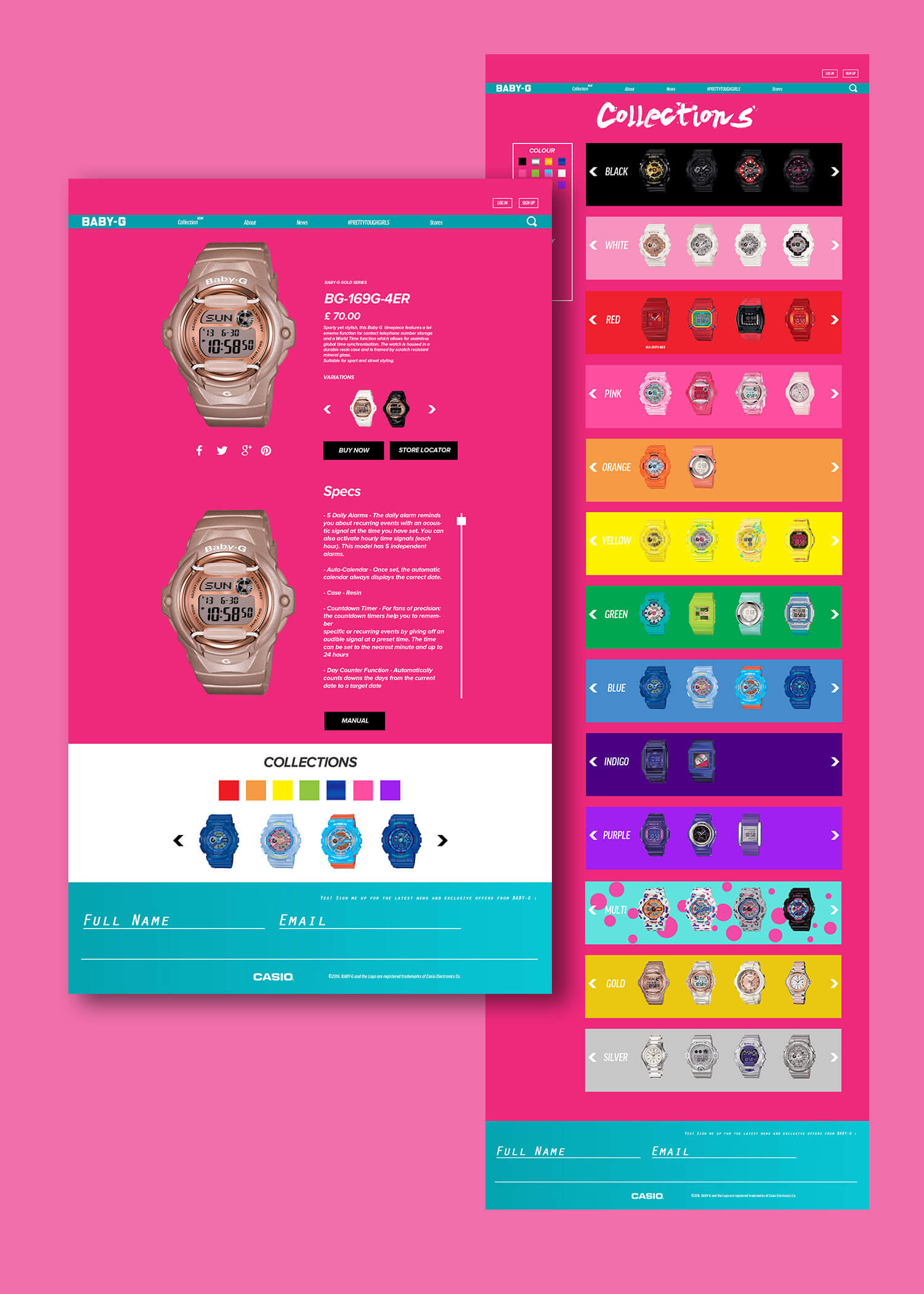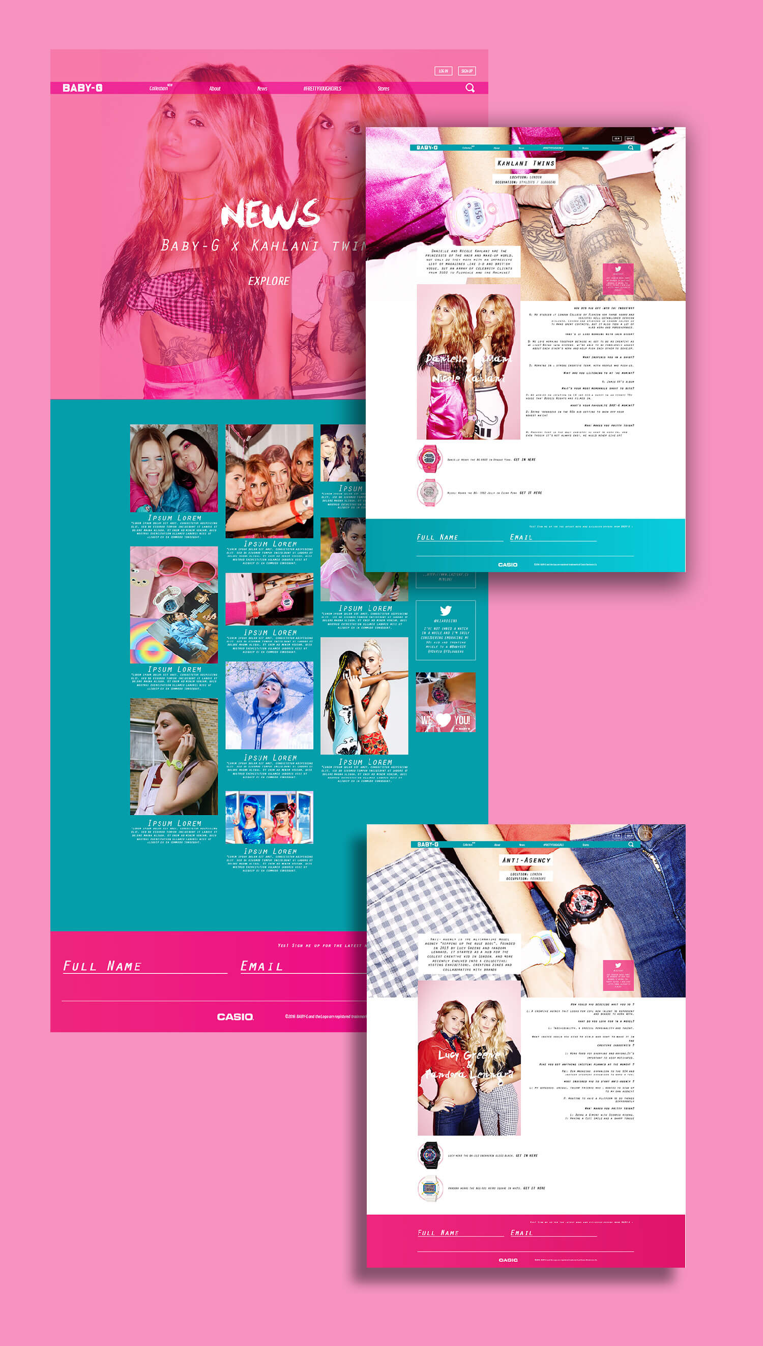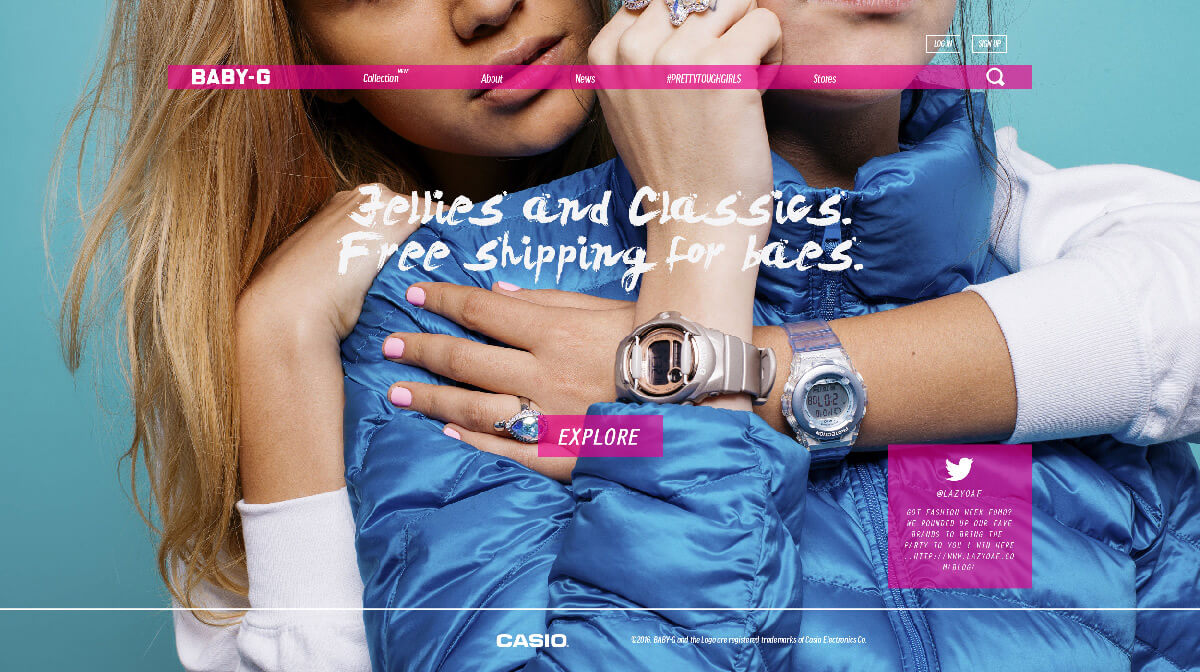 The concept behind the Baby-G website was to use the nostalgia of it’s past to cater to female creatives and influencers of today. With that in mind, the website is designed as an online magazine which is branded under the term “feminine and fierce”.